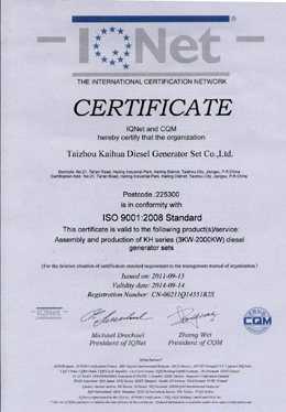 目前,公司已在全國32個(gè)省、市、自治區(qū)建立了20余家辦事處,在全世界30多個(gè)國家和地區(qū)擁有眾多的用戶群。隨時(shí)為用戶提供設(shè)計(jì)、供應(yīng)、調(diào)試、維修一條龍服務(wù)。 “凱華”已成為中國發(fā)電機(jī)組行業(yè)重要的品牌之一。公司技術(shù)力量雄厚,生產(chǎn)工藝先進(jìn),檢測設(shè)備齊全,質(zhì)量可靠,管理科學(xué),產(chǎn)品種類繁多。產(chǎn)品各項(xiàng)性能均嚴(yán)格按照國家相關(guān)標(biāo)準(zhǔn)。凱華是國內(nèi)少數(shù)嚴(yán)格按照ISO8528國際質(zhì)量標(biāo)準(zhǔn)生產(chǎn)柴油發(fā)電機(jī)組的廠家,在行業(yè)內(nèi)率先通過ISO9001:2008質(zhì)量管理體系認(rèn)證。